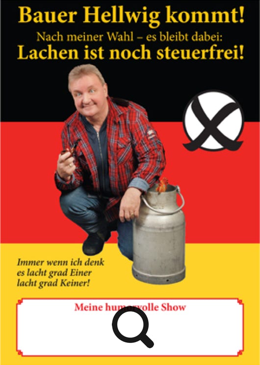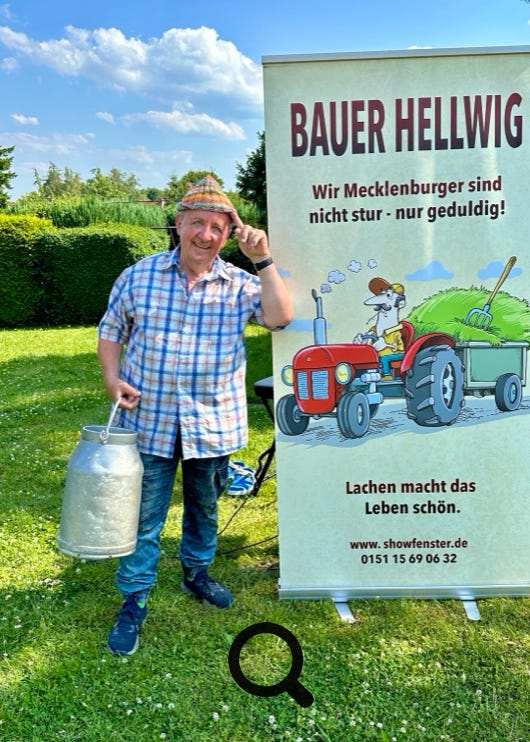 Die humorvolle Showeinlage für Familienfeste, Geburtstag, die Silberhochzeit oder die goldene Hochzeit. Das Geburtstagskind oder die Jubilare werden auf nette und humorvolle Weise in die Show einbezogen, so daß immer ein ganz persönliches Erlebnis entsteht. Die Gäste sollen mitsingen, schunkeln und Spaß haben. Lachen macht das Leben schön, sagt unser Bauer Hellwig.